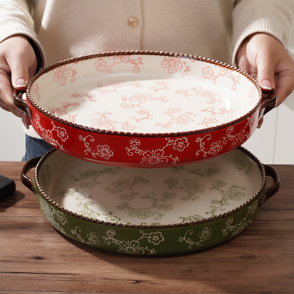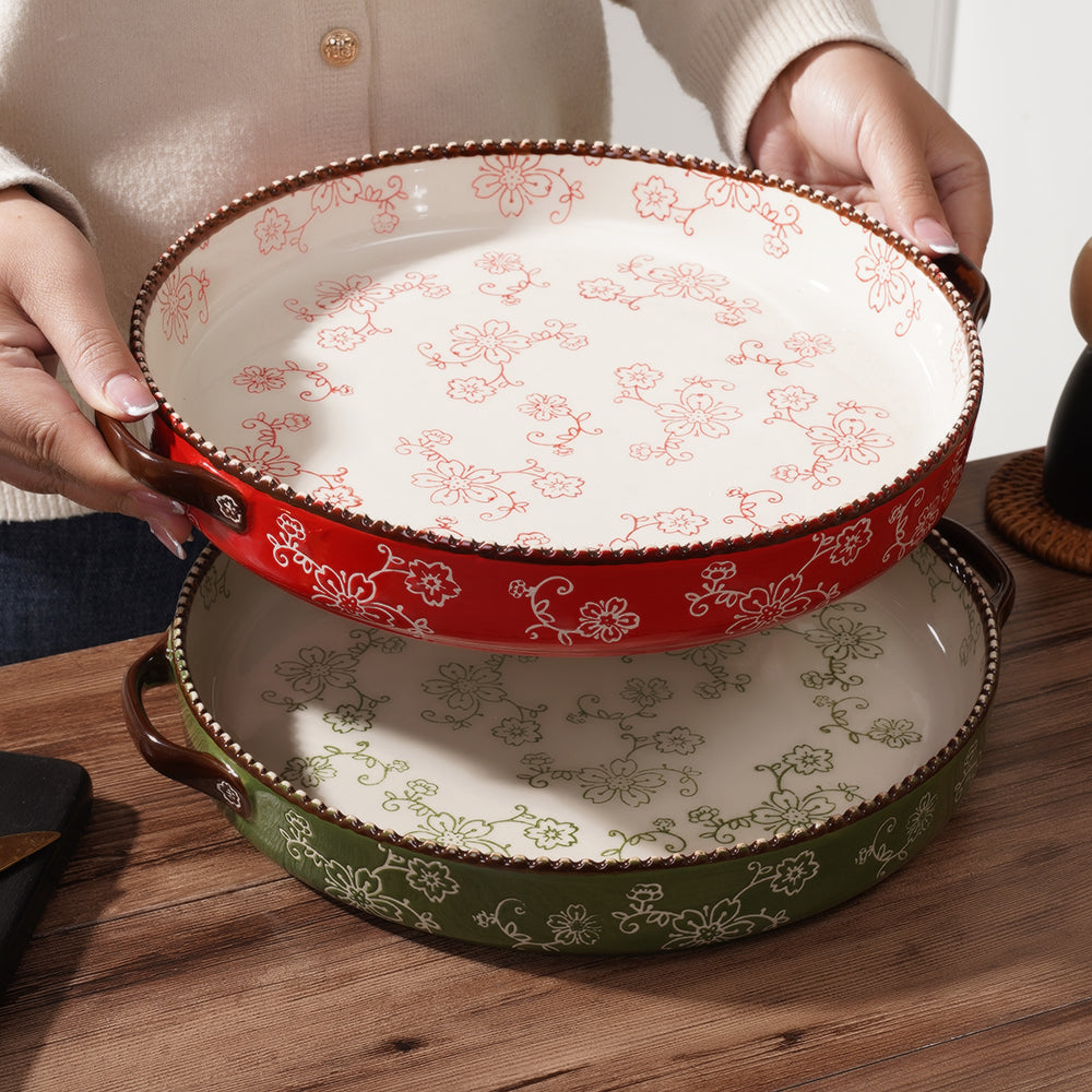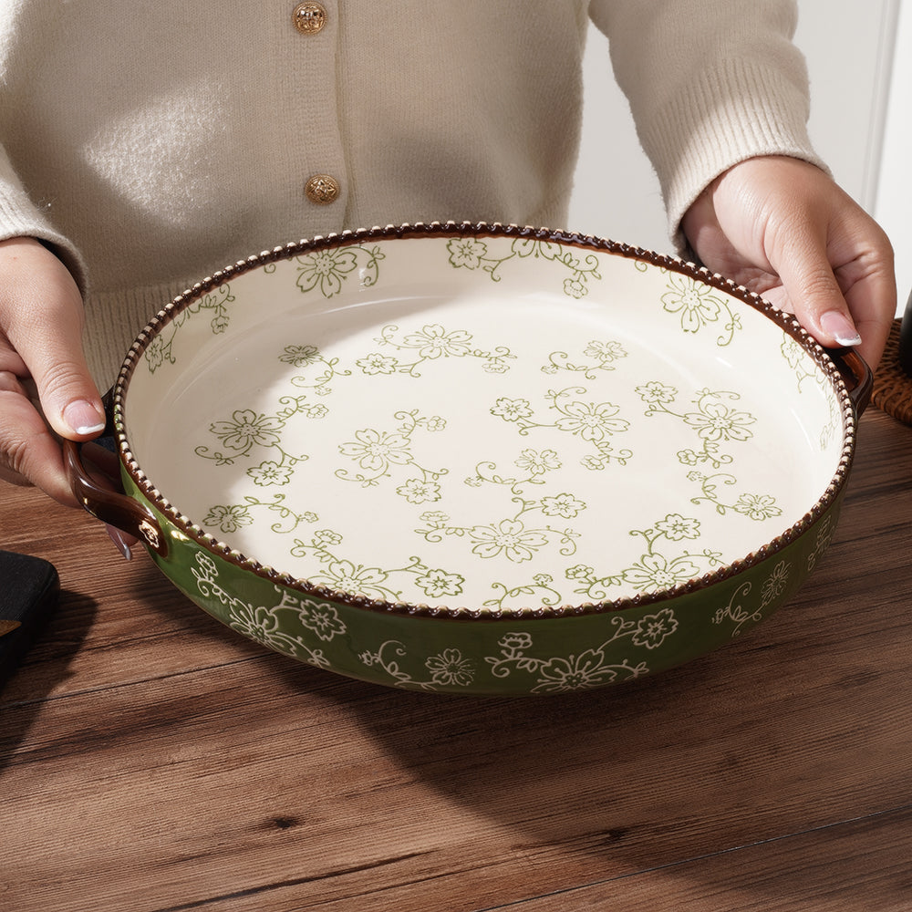 Ixora Ceramic 11 Inch Round Baking Dish with Double Handle, 28 Ounce Deep Plate for Kitchen, Cooking, Roasting Lasagna green